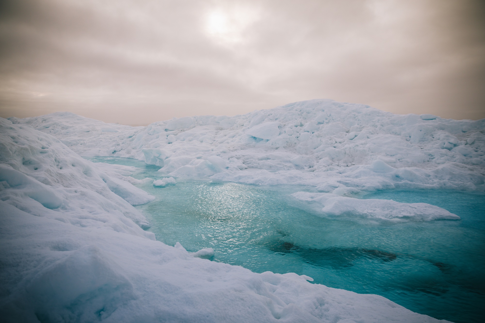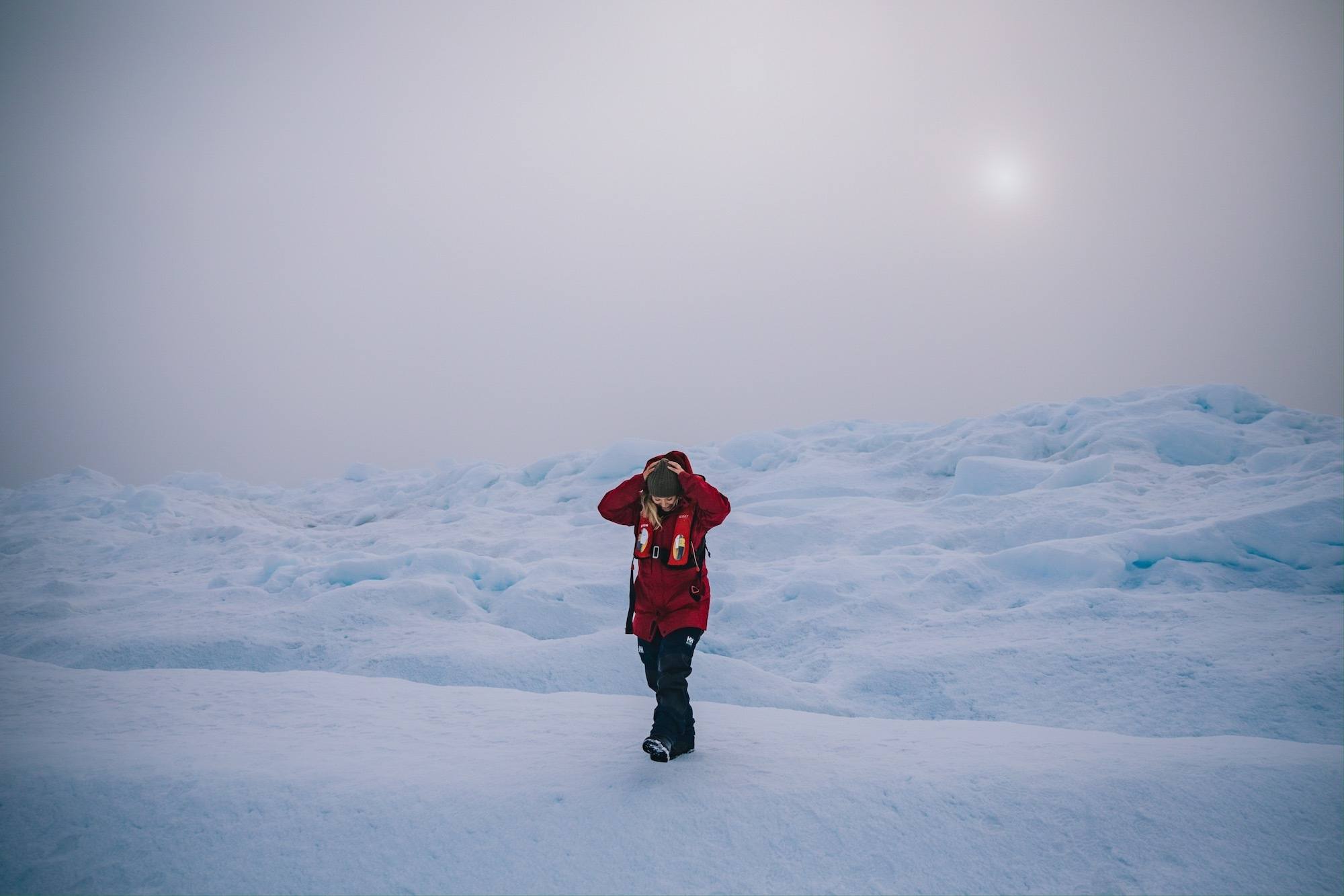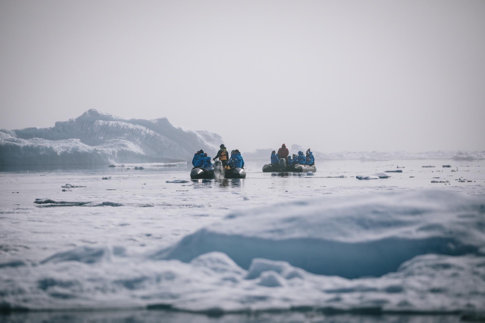 We spent some time exploring the pack ice in northern Baffin Bay before our expedition leader found a large, solid, and old, safe patch of sea ice. It was misty and beautiful, making the blue of the ice pop against moody skies. Every so often, the sun would peek through the fog, creating the most incredible atmosphere.